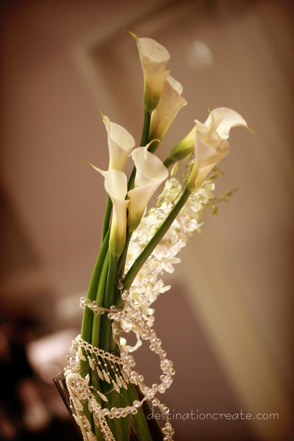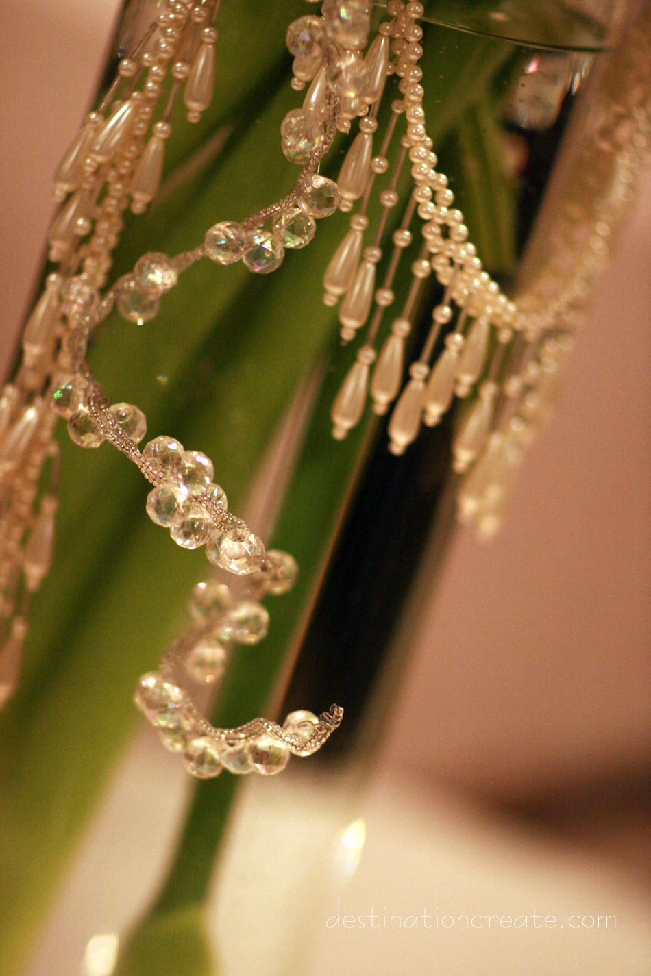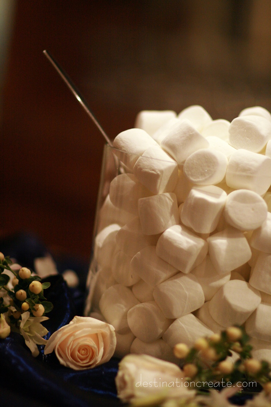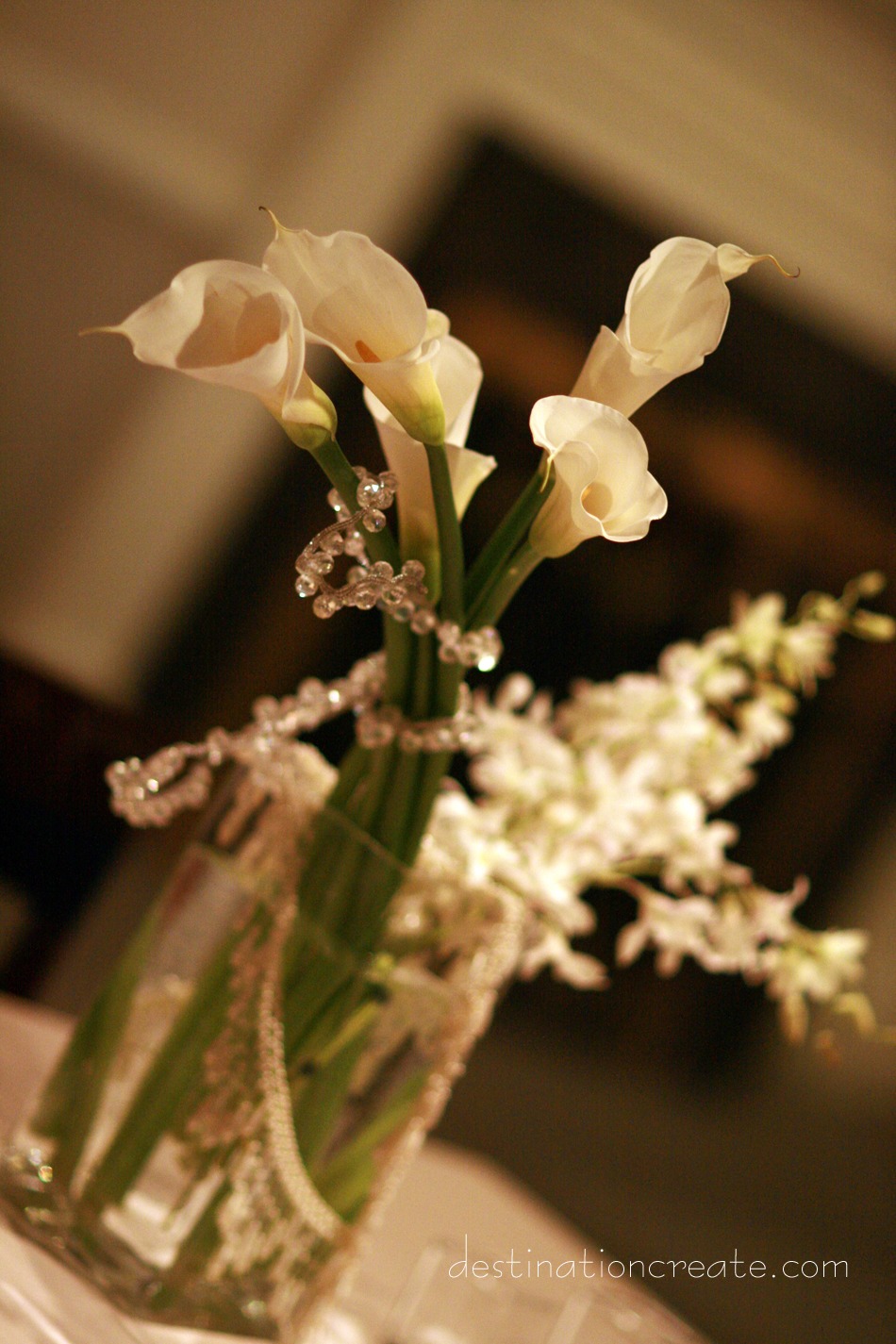 The hot chocolate bar at this December wedding was a huge hit for the guests. I dressed up the white florals with beads and crystal garlands.