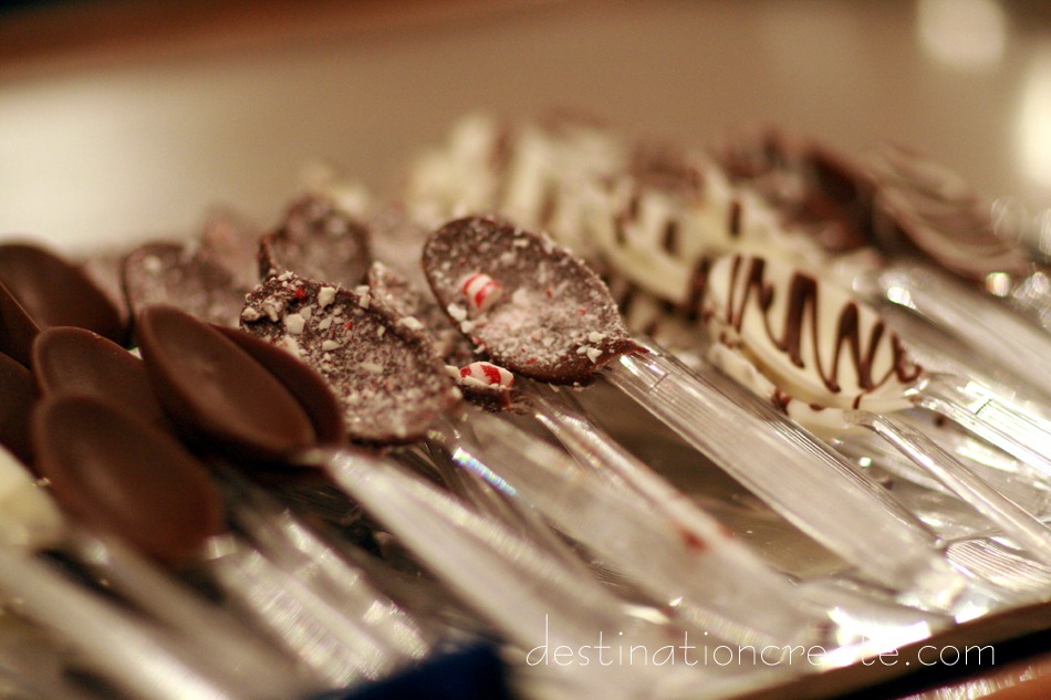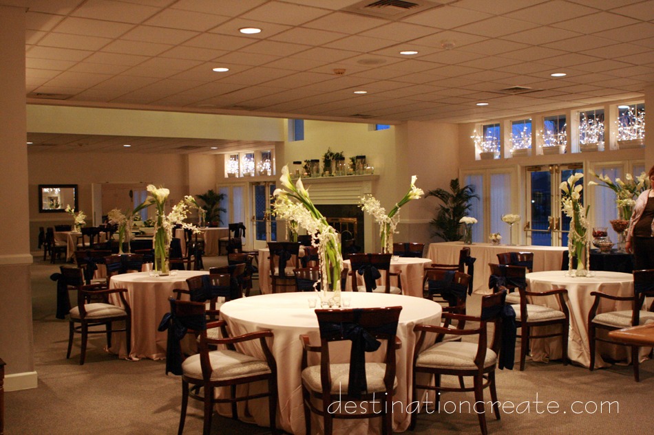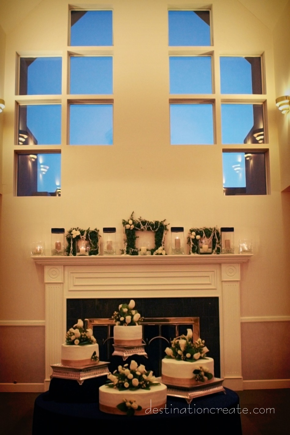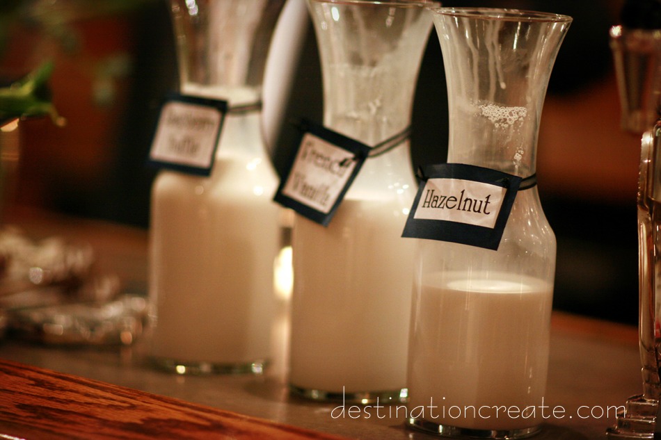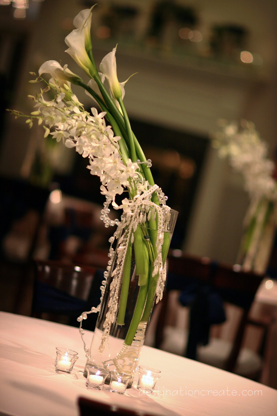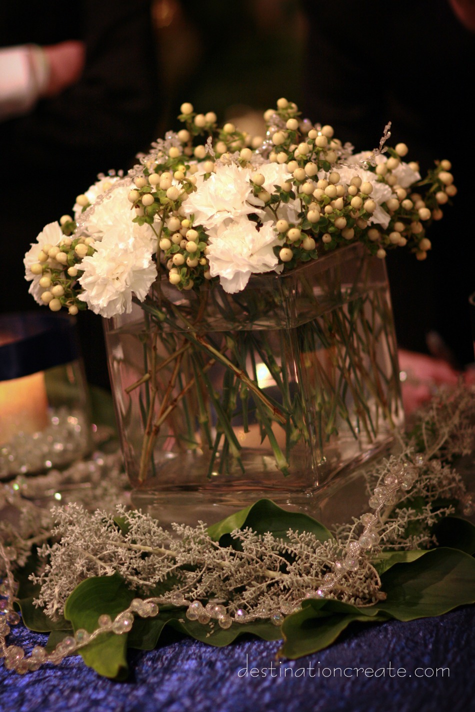 The hot chocolate bar at this December wedding was a huge hit for the guests. I dressed up the white florals with beads and crystal garlands.